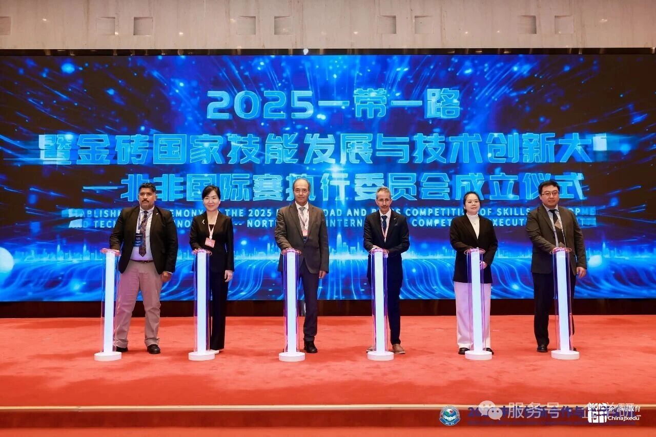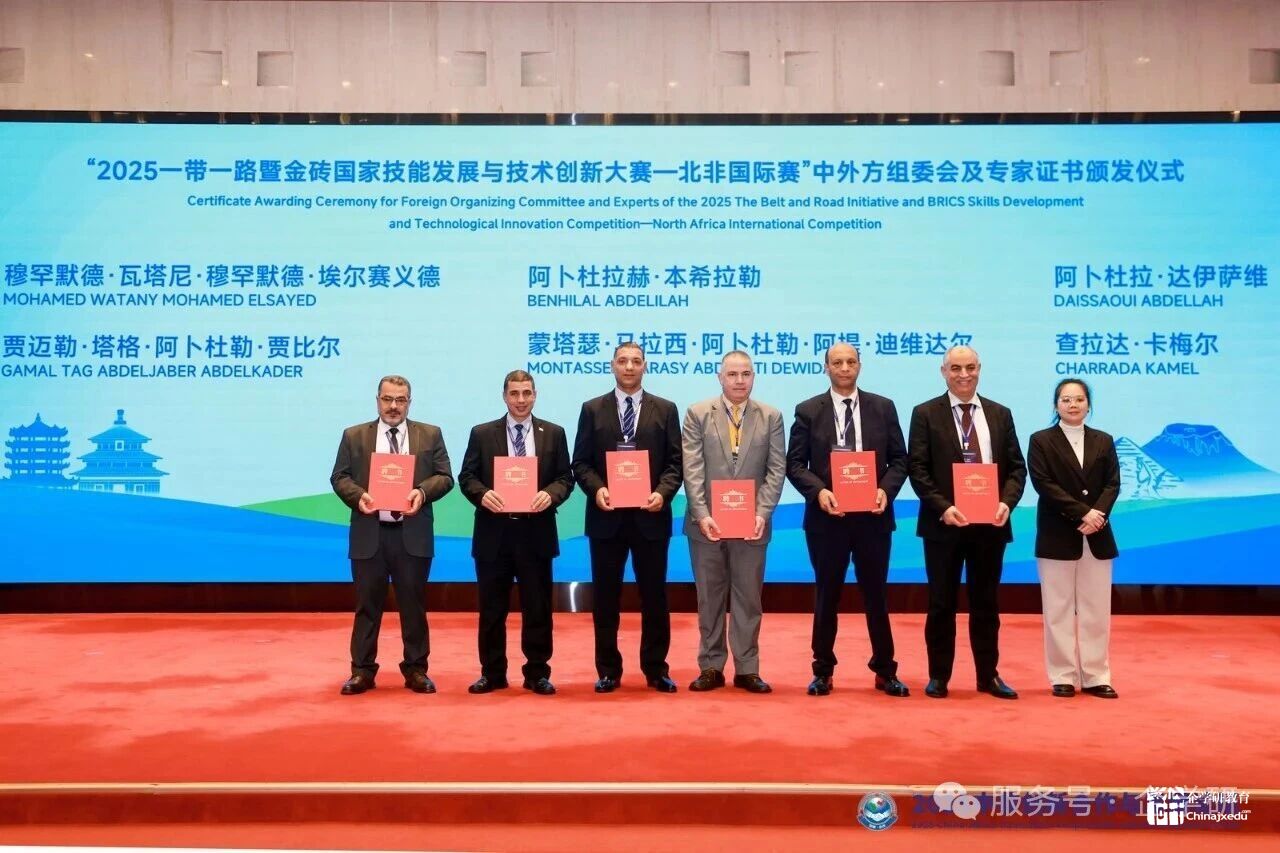 2025年11月22日,“2025一帶一路暨金磚國家技能發展與技術創新大賽—北非國際賽執行委員會成立儀式”和“中外方組委會暨專家證書頒發儀式”在武漢中非教育合作創新發展論壇上舉行。中北非國際教育創新聯盟副主席巴爾卡維、摩洛哥中北非國際教育創新聯盟副主席馬祖茲、突尼斯中北非國際教育創新聯盟副主席凱斯、中北非國際教育創新聯盟秘書長陳璐、廈門市金磚未來技能發展與技術創新研究院的國際部部長朱秀青、北京企學研教育科技研究院副院長李昂共同參加“2025一帶一路暨金磚國家技能發展與技術創新大賽—北非國際賽執行委員會成立儀式”。
