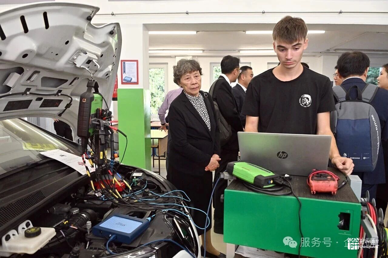 吉林科技職業技術學院交通運輸工程學院副院長常鶴為匈牙利卡爾曼·薩爾瓦里技術學校專家展示中國新能源汽車教學裝備和數字課程。