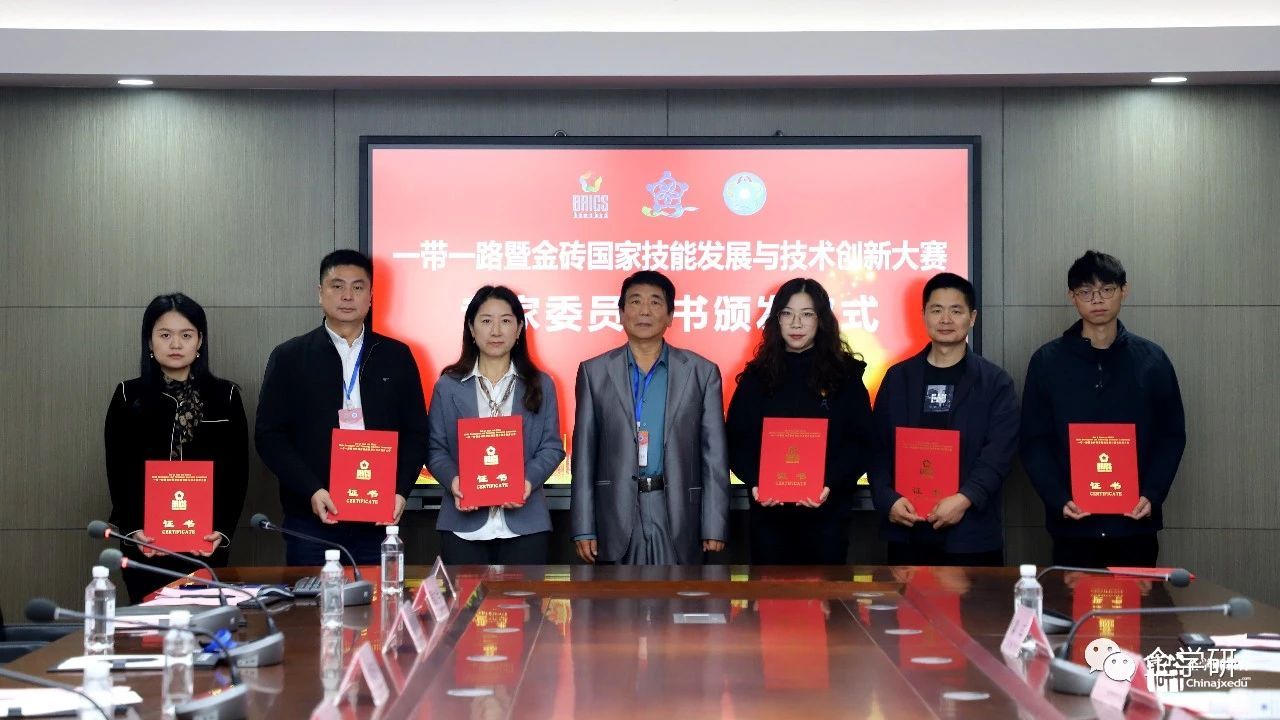 一帶一路暨金磚國家技能發展與技術創新大賽賽項技術委員主任、清華大學基礎工業訓練中心顧問付宏生教授為四川工程職業技術學院教授傅駿教授、重慶工程職業技術學院教師邵明輝、成都紡織高等專科學校教師胡曉華、河源職業技術學院劉俊英、西南財經大學天府學院智能金融學院副院長陳嫻、蘇州市職業大學副教授宋秦中頒發大賽專家委員證書。