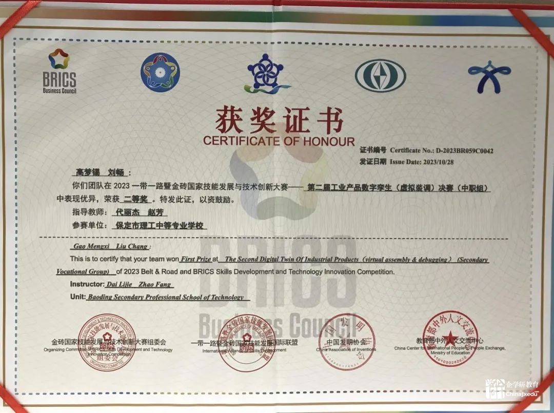 保定市理工中等專業學校榮獲2023金磚大賽之第二屆工業產品數字孿生賽項團體二等獎