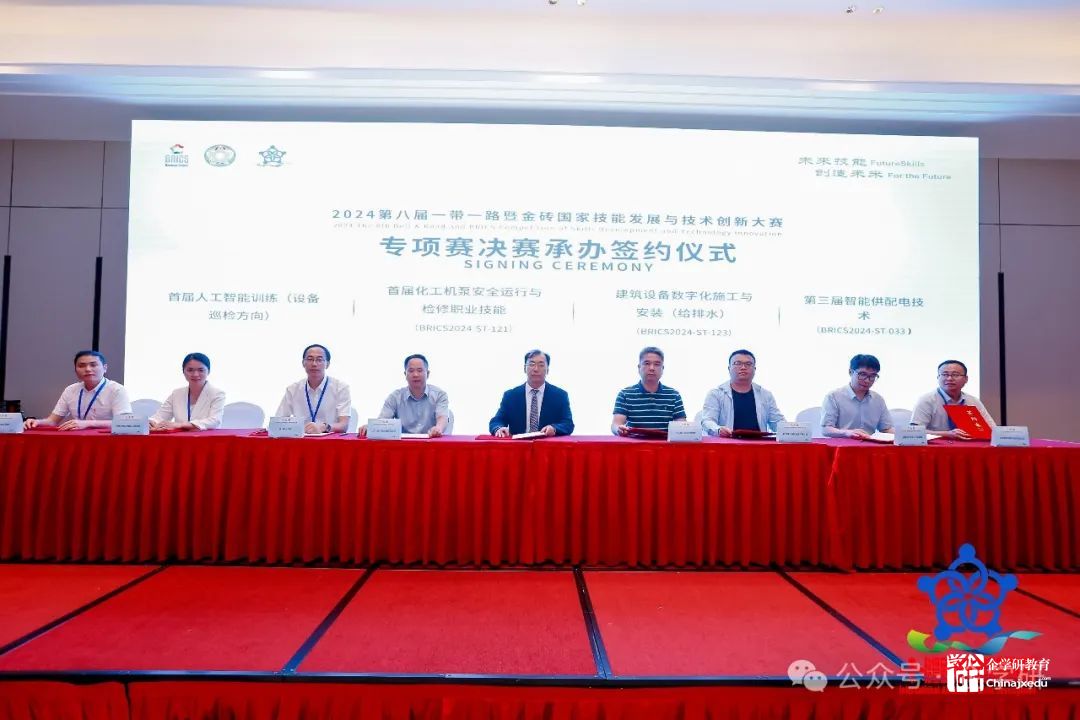 2024年6月5日,重慶輕工職業(yè)學(xué)院承辦首屆人工智能訓(xùn)練(設(shè)備巡檢方向)賽項決賽簽約儀式在北京舉行。 金磚國家工商理事會技能發(fā)展、應(yīng)用技術(shù)與創(chuàng)新中方工作組組長、金磚國家技能發(fā)展與技術(shù)創(chuàng)新大賽組委會執(zhí)委會主席劉振英、北京企學(xué)研教育科技研究院競賽合作處主任周海燕,重慶輕工職業(yè)學(xué)院教務(wù)處副處長、雙高辦副主任譚治云簽署承辦協(xié)議。同時簽署承辦的還有化工泵安全運(yùn)行與檢修、建筑設(shè)備數(shù)字化施工與安裝(給排水)、智能供配電技術(shù)等賽項單位。
