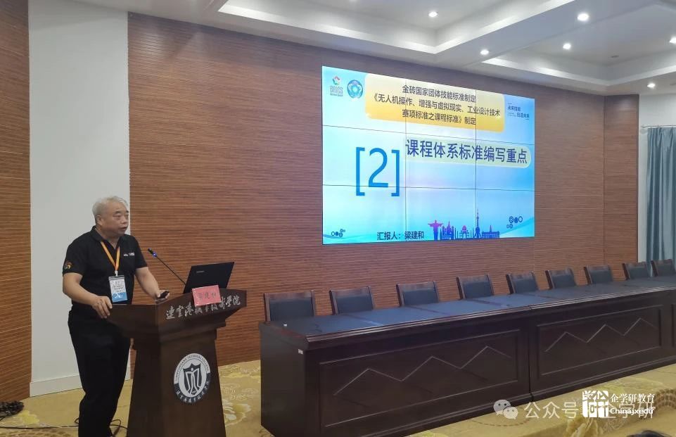 北京企學研教育科技研究院副院長李昂介紹無人機操作、增強與虛擬現實、工業設計技術賽項標準工作階段進展