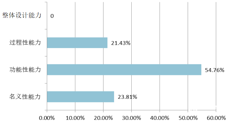 例如:某學校汽車學院(系)在測試中,收到42份有效測試卷,這些參加測試學生的能力水平百分比分布如圖所示。其中:23.81 %處于“名義性能力”,54.76%達到“功能性能力”,21.43%達到“過程性能力”,0%達到“整體設計能力”。