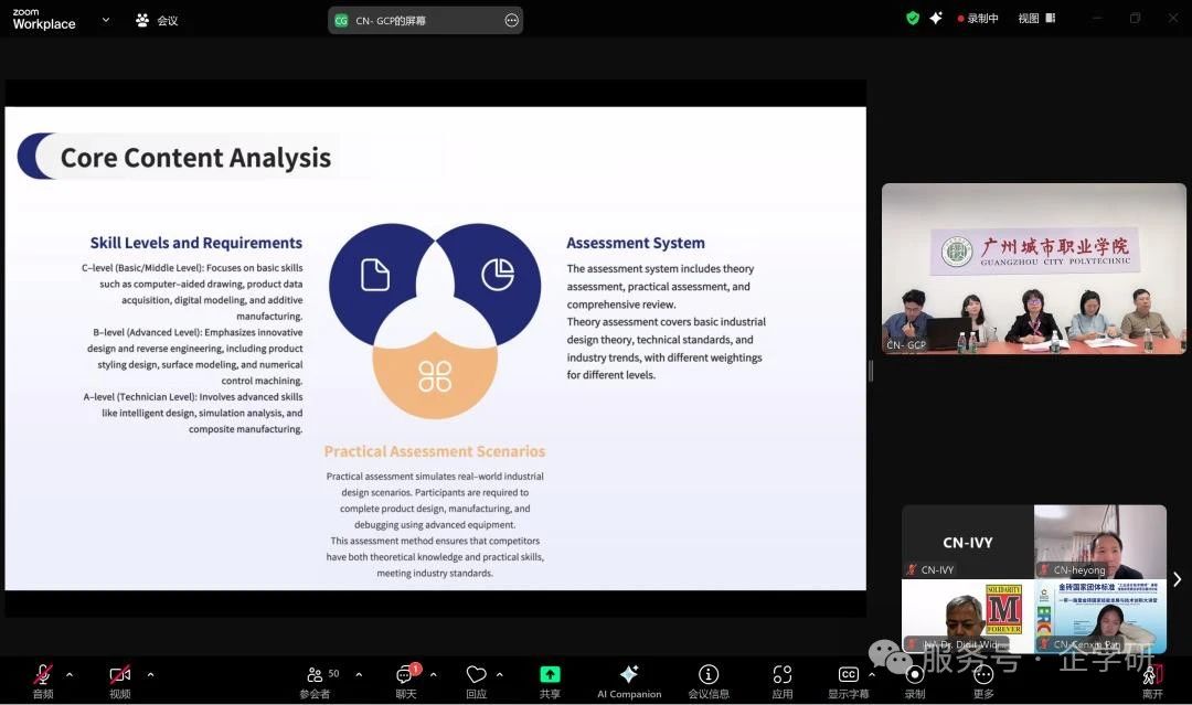 會(huì)上,金磚國家團(tuán)體標(biāo)準(zhǔn)“工業(yè)設(shè)計(jì)技術(shù)賽項(xiàng)”標(biāo)準(zhǔn)起草工作組專家代表單位——廣州城市職業(yè)學(xué)院、無錫立信高等職業(yè)技術(shù)學(xué)校領(lǐng)導(dǎo)出席會(huì)議,并介紹學(xué)校在專業(yè)建設(shè)、標(biāo)準(zhǔn)編寫、國際合作等方面的建設(shè)成果;同時(shí),與會(huì)的工業(yè)設(shè)計(jì)中方專家肖堯、廣州城市職業(yè)學(xué)院付文濤、無錫立信高等職業(yè)技術(shù)學(xué)校潘岑欣等分別就競賽、技能、課程三份標(biāo)準(zhǔn)的起草背景、結(jié)構(gòu)設(shè)計(jì)、編寫過程等內(nèi)容進(jìn)行介紹,對征集到的各方意見進(jìn)行反饋。