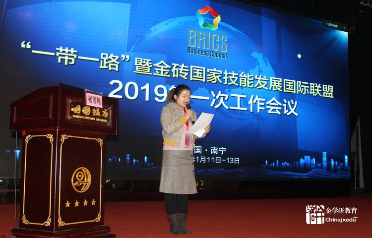 金磚國家工商理事會技能發展工作組執行總監崔雪艷宣讀第六批一帶一路暨金磚國家技能發展國際聯盟成員名單。