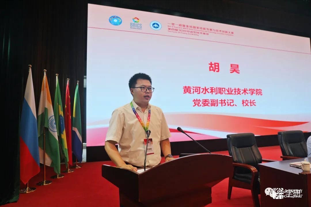 7月8日,一帶一路暨金磚國(guó)家技能發(fā)展與技術(shù)創(chuàng)新大賽第四屆3D打印造型技術(shù)賽項(xiàng)在黃河水利職業(yè)技術(shù)學(xué)院隆重開幕。金磚國(guó)家工商理事會(huì)中方技能組主席、一帶一路暨金磚國(guó)家技能發(fā)展國(guó)際聯(lián)盟理事長(zhǎng)、金磚國(guó)家技能發(fā)展與技術(shù)創(chuàng)新大賽組委會(huì)執(zhí)委會(huì)主席劉振英,河南省教育廳二級(jí)巡視員董玉民,金磚國(guó)家技能發(fā)展與技術(shù)創(chuàng)新大賽組委會(huì)執(zhí)委會(huì)副主席何勇,河南省終身教育協(xié)會(huì)秘書長(zhǎng)、河南省成人教育教研室原書記宋正武,金磚大賽技術(shù)委員會(huì)主任、清華大學(xué)基礎(chǔ)訓(xùn)練中心顧問(wèn)付宏生,黨委書記周保平,黨委副書記、校長(zhǎng)胡昊出席開幕式,中國(guó)、巴基斯坦、津巴布韋、多哥、尼日利亞5個(gè)國(guó)家的51支參賽隊(duì)和競(jìng)賽支持單位,近200人參加開幕式。開幕式由胡昊主持。