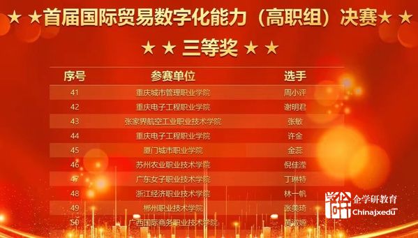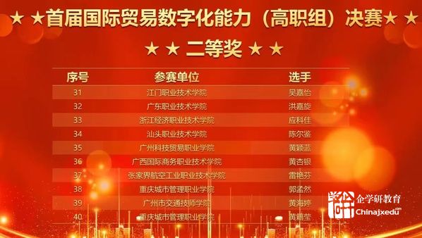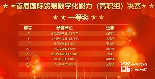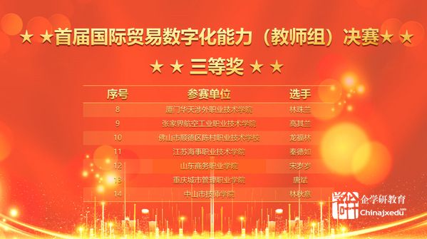首屆國(guó)際貿(mào)易數(shù)字化能力大賽自今年5月開(kāi)啟報(bào)名,參與初賽共1132支隊(duì)伍,我校6名選手均以選拔賽一等獎(jiǎng)的成績(jī)順利入圍11月25-27日的總決賽。經(jīng)過(guò)300分鐘,4個(gè)模塊的綜合比拼,商學(xué)院關(guān)務(wù)與外貿(mào)服務(wù)專業(yè)黃鴻獲得決賽一等獎(jiǎng),郭孟然、黃籍瑩獲得二等獎(jiǎng),國(guó)際經(jīng)濟(jì)與貿(mào)易專業(yè)丁小萍獲得三等獎(jiǎng),商學(xué)院唐斌教授獲得教師組三等獎(jiǎng)。
