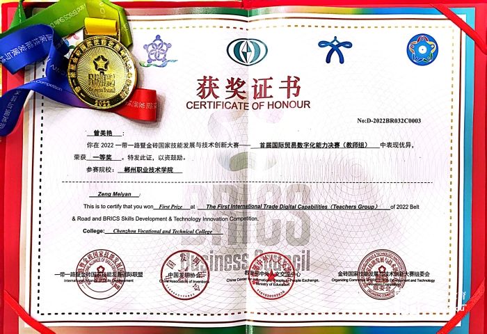 本網(wǎng)訊(通訊員 郴職宣)近日,由金磚國(guó)家工商理事(BRICSBC)一帶一路暨金磚國(guó)家技能發(fā)展國(guó)際聯(lián)盟(IASDB)、教育部中外人文交流中心等單位聯(lián)合主辦的2022一帶一路暨金磚國(guó)家技能發(fā)展與技術(shù)創(chuàng)新大賽圓滿落幕,我校商貿(mào)旅游學(xué)院教師曾美艷在首屆國(guó)際貿(mào)易數(shù)字化能力賽項(xiàng)(教師組)全國(guó)總決賽中取得全國(guó)第三名,斬獲國(guó)賽一等獎(jiǎng)。我校也在該項(xiàng)賽事組織中被組委會(huì)授予“最佳組織獎(jiǎng)”。
