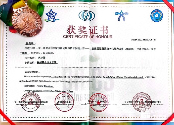 此外,2020級(jí)現(xiàn)代物流管理專業(yè)張美琦同學(xué)在商貿(mào)旅游學(xué)院黃冰婷老師的指導(dǎo)下,獲得國(guó)際貿(mào)易數(shù)字化能力賽項(xiàng)全國(guó)總決賽三等獎(jiǎng)。